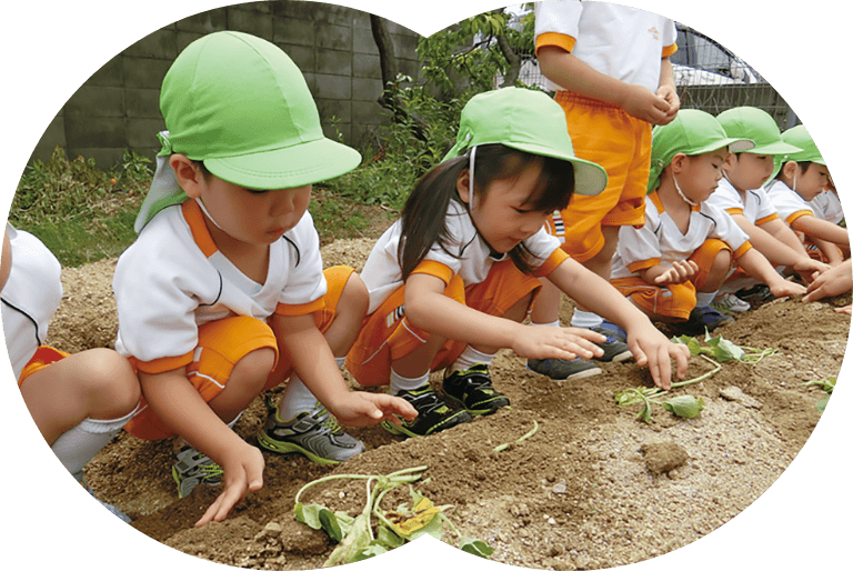 様々な人・物と関係性をもち、触れ合いの中での実体験から、生命を尊重する心、思いやり、社会性、美しいものや自然に感動する心を育みます。